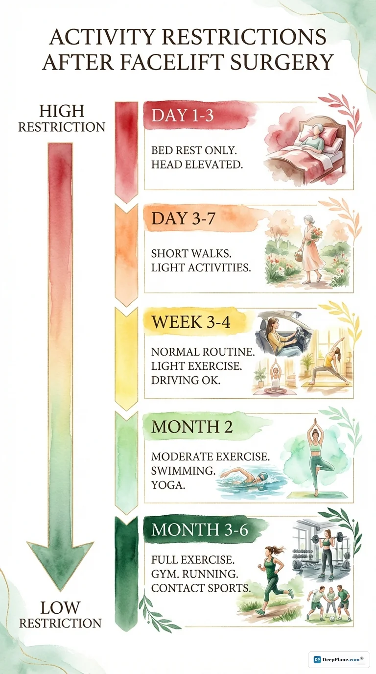 Key Takeaway: Desk work at 10-14 days. Social activities at 2-3 weeks. Exercise at 4-6 weeks. Air travel at 2-3 weeks. Recovery comparable to SMAS but with 2-3x longer-lasting results.