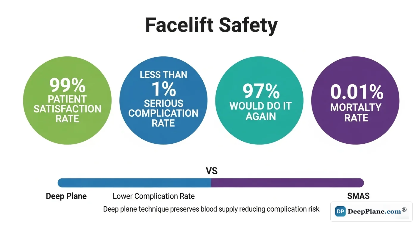 Deep plane facelift is considered safe when performed by an experienced surgeon, with a serious complication rate under 2%. It's actually safer than traditional techniques in some ways — better blood supply preservation reduces skin necrosis risk, and direct visualization protects facial nerves. Over 150,000 facelifts are performed annually in the US with a 97% patient satisfaction rate.
