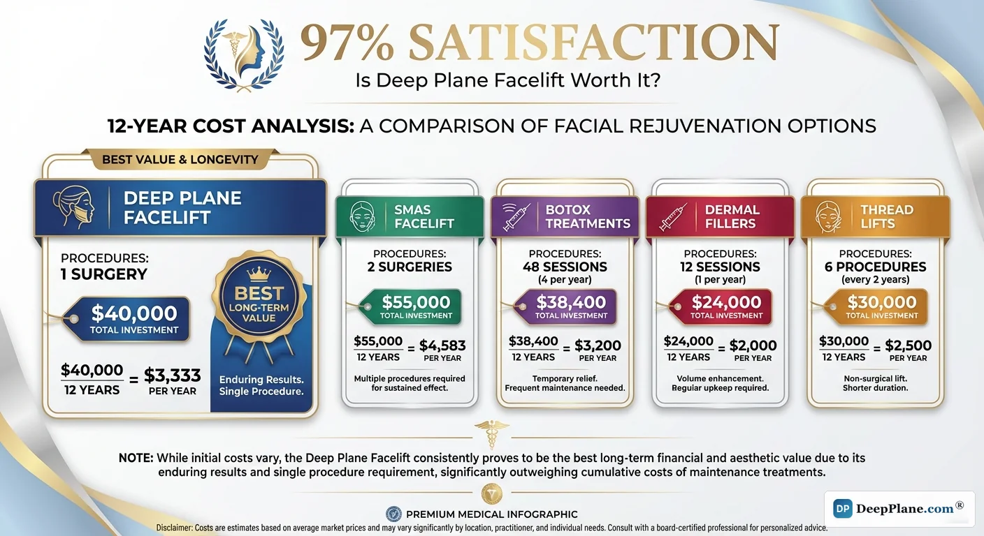 Key Takeaway: Deep plane facelift is worth it for 95-97% of patients. At $3,333/year over 15 years, it costs less than annual Botox + fillers ($4,000-$8,000/yr) and provides permanent structural improvement.